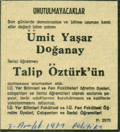 1979 yılının Aralık ayında yayımladıkları bu anma ilanıyla iki değerli aydını andılar: