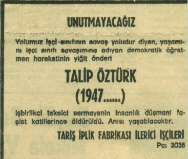 Talip Öztürk’ün mücadelesini işçi hareketinin genel cephesiyle buluşturan metinlerdir.