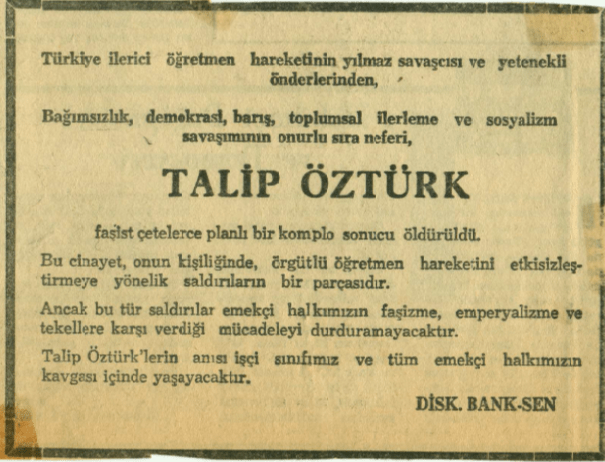 DİSK’e bağlı sendikalar, kamu işçileri, metal ve tekstil emekçileri, yayımladıkları ilanlarda Talip Öztürk’ü “emek davasının öncüsü” olarak selamladılar.