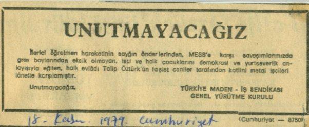 Öğretmenlerin demokrasi mücadelesiyle işçilerin üretim alanındaki direnişi, bu anma ilanlarda tek bir politik hatta birleşmiştir.